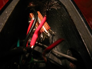 Häussels im Standardbetrieb: Weiss und rot gehen unter Schrumpfschlauch zusammen. Grün und blank gehen zusammen hinten am Schalter an die Masse (hier dicke schwarze Verlängerung). Die schwarzen Strippen sind jeweils der heiße Draht und gehen vorne links und rechts außen an den Dreiwegschalter. Bei der Höheneinstellung der Pickups erstmal schön Abstand halten.