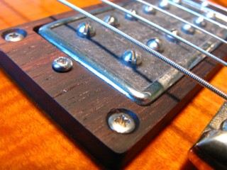 Nächste Aktion ist der Austausch der Pickup-Rähmchen gegen eine Custom-Version aus ostindischem Palisander. Mit etwas Glück trifft man den Farbton des Griffbretts. Wir haben uns die Rahmen einen Millimeter dicker als die Originale fertigen lassen. Der neue Rahmen für den Hals-PU hat jetzt eine Stärke von 4 statt 3 mm - für den Bridge-Frame nun entsprechend 6 anstelle von 5 mm. Hauptsache, die Tonabnehmer überragen in ihrer optimalen Höheneinstellung noch ihre Rahmen.