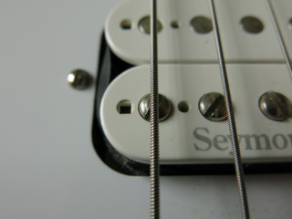 Nur die Lagerschraube unter der dicken Esaite muss wieder raus. Dann wird das Tremolo in diesem Fall nach links verschoben, das alte Bohrloch mit Leim verpfropft und ein neues weiter links gebohrt. Über den Pickups ist der Saitenverlauf jetzt zentriert.
